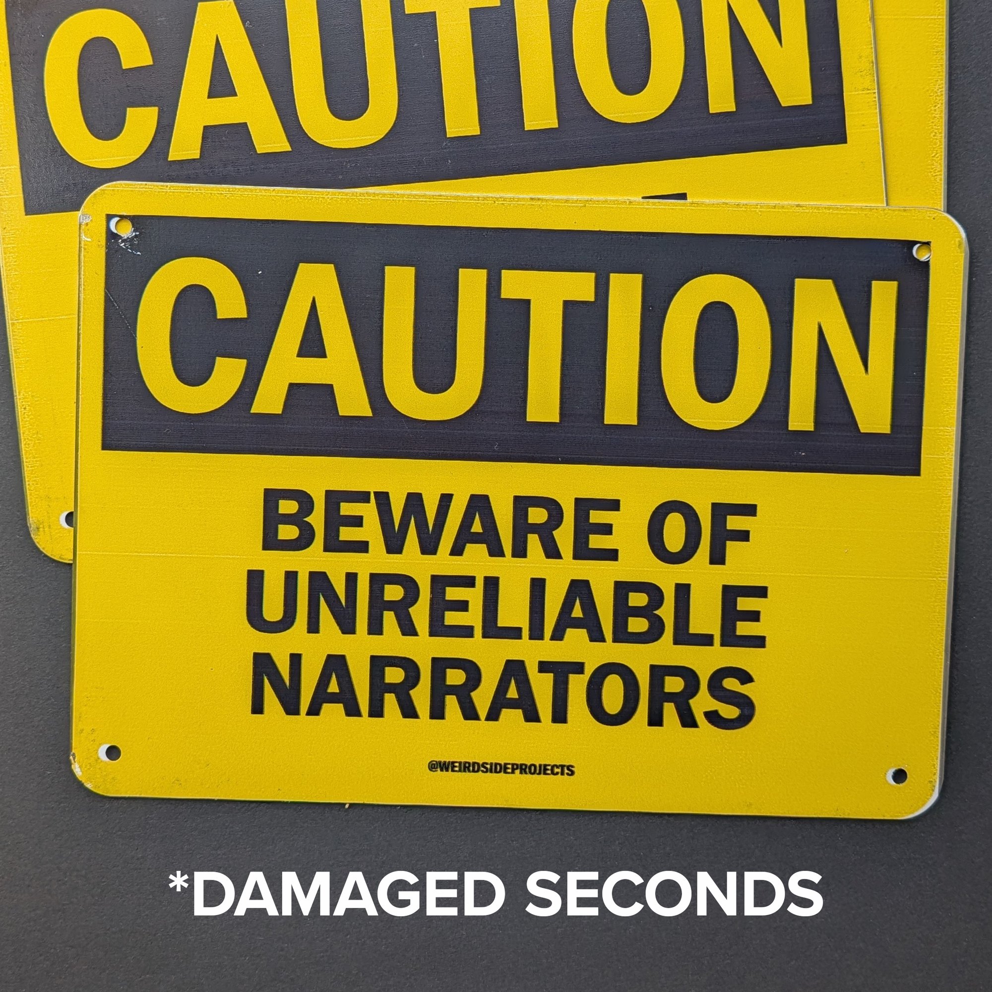 (DAMAGED SECONDS) CAUTION: BEWARE OF UNRELIABLE NARRATORS sign